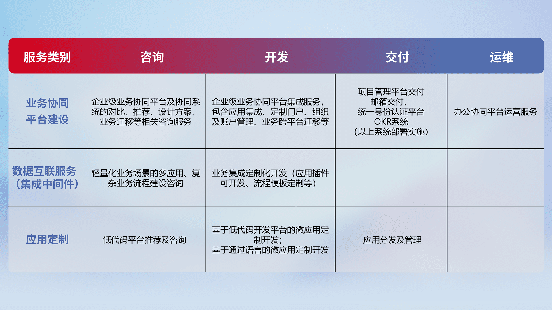 针对钉钉、、、、企微、、、IDaas等平台级产品提供产品的规划、、、方案、、、交付、、定制化开发等服务,,,实现如统一协同办公、、智能客户服务、、混合会议管理、、智能数据查询、、等业务场景,,,,实现数字化转型。。
